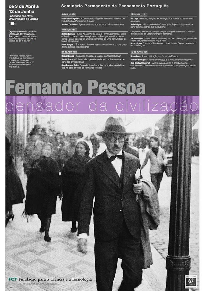 O Ciclo de conferências | Fernando Pessoa, pensador da civilização decorre neste semestre e, a 12 de junho pelas 17h00, no Centro de Filosofia da Universidade de Lisboa, integra a comunicação Fernando Pessoa e o «choque de civilizações», por Fabrizio Boscaglia.