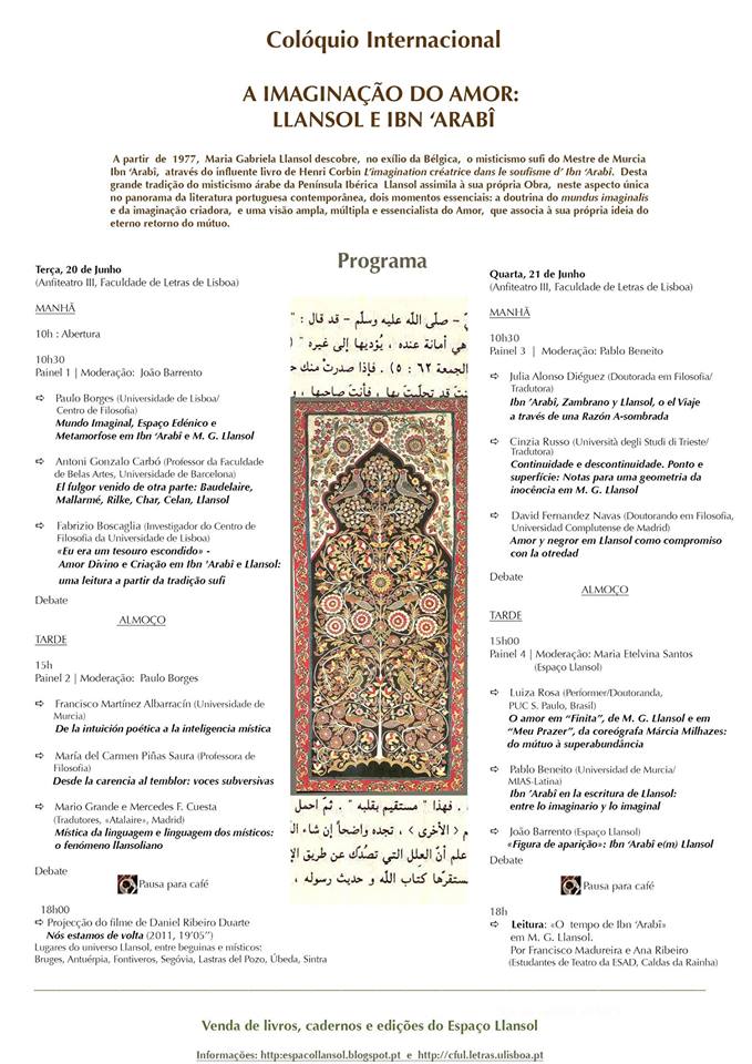Integro com muito prazer o programa deste Colóquio Internacional, com a minha comunicação intitulada «”Eu era um tesouro escondido” – Amor divino e criação em Ibn ‘Arabî e Llansol: uma leitura a partir da tradição sufi», no dia 20 de junho às 10h30. A seguir, orientarei uma visita guiada à exposição Árabes e Islão na Literatura e no Pensamento Português (1826-1935), na BNP.