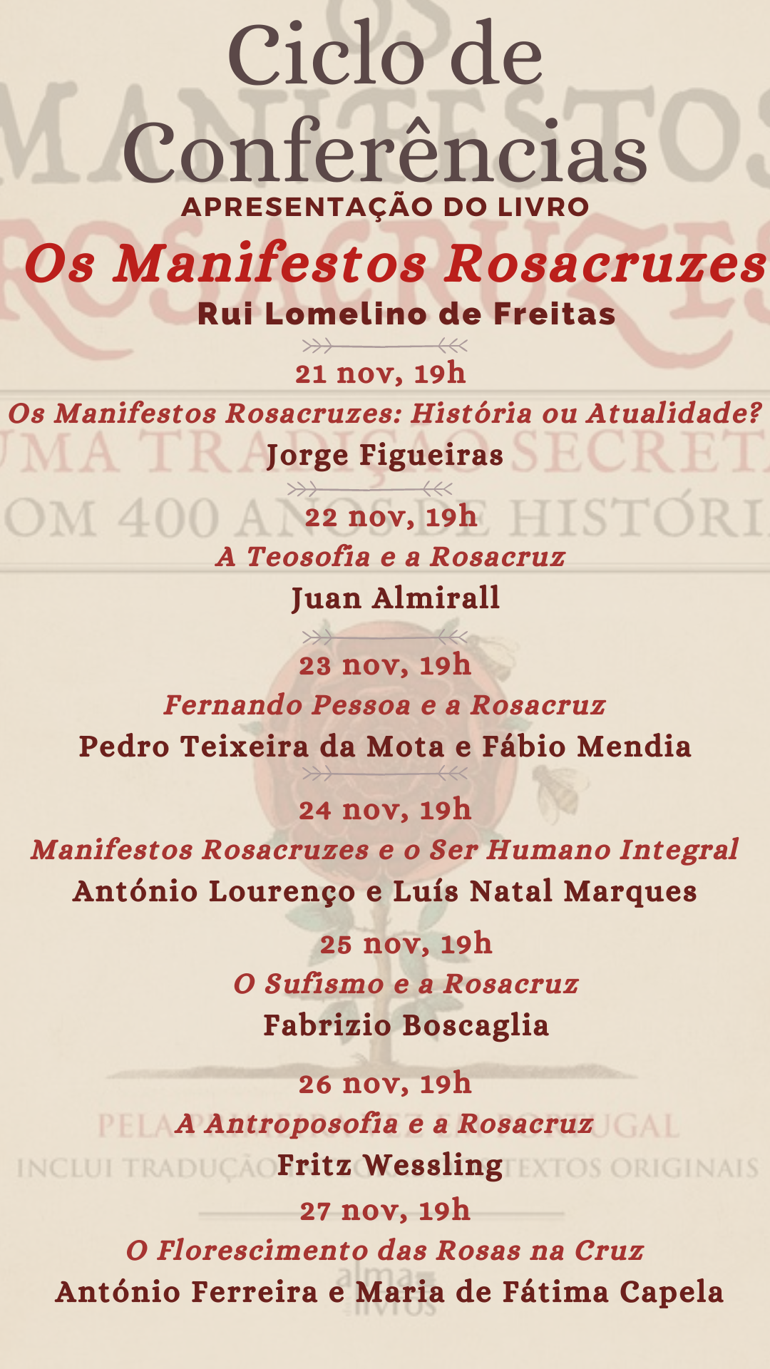 Participo na sessão «O Sufismo e a Rosacruz», agendada para decorrer online a 25 de novembro às 19h, no contexto das conferências de apresentação do livro Os Manifestos Rosacruzes: Uma Tradição com 400 Anos de História (ed. Alma dos Livros), traduzido por Rui Lomelino de Freitas, este sendo o anfitrião da sessão.