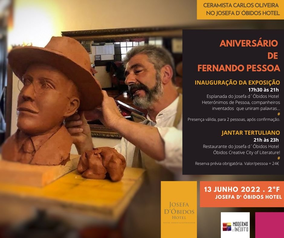 No dia 13 de junho, em que Fernando Pessoa faria 134 anos, sou convidado a participar na inauguração da exposição do ceramista Carlos Oliveira Escultor, dedicada ao poeta e pensador português, organizada pelo Josefa D’Óbidos – Hotel. Mais uma ocasião para vivenciar Óbidos Vila Literária.