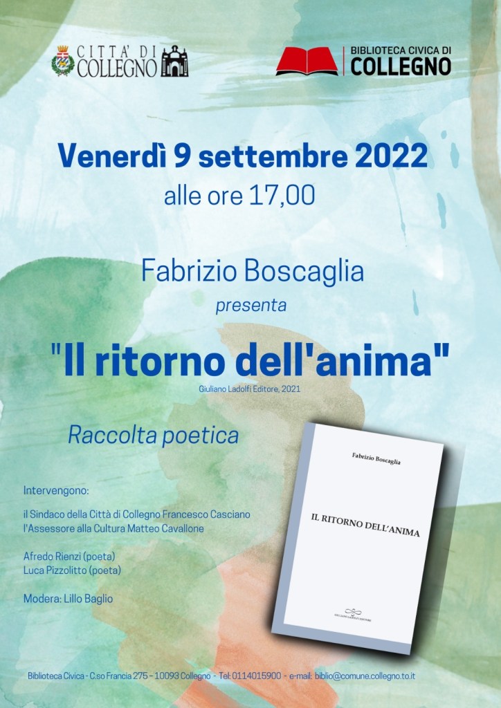 É uma grande alegria apresentar o meu livro de poemas Il ritorno dell’anima (Ladolfi, 2021) na biblioteca da minha cidade de origem, Collegno (Itália, zona de Turim). Com a presença do presidente da Câmara Municipal Francesco Casciano, do vereador Matteo Cavallone, e dos poetas Alfredo Rienzi, Luca Pizzolitto e Lillo Baglio. Evento agendado para 9 de setembro de 2022.