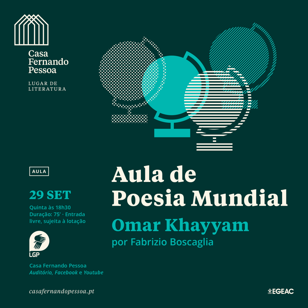 É com muita alegria que me preparo para lecionar uma das «Aulas de Poesia Mundial», na Casa Fernando Pessoa, sobre a presença do poeta persa medieval Omar Khayyam na obra e na biblioteca particular de Fernando Pessoa. A sessão está agendada para o dia 29 de setembro às 18h30.