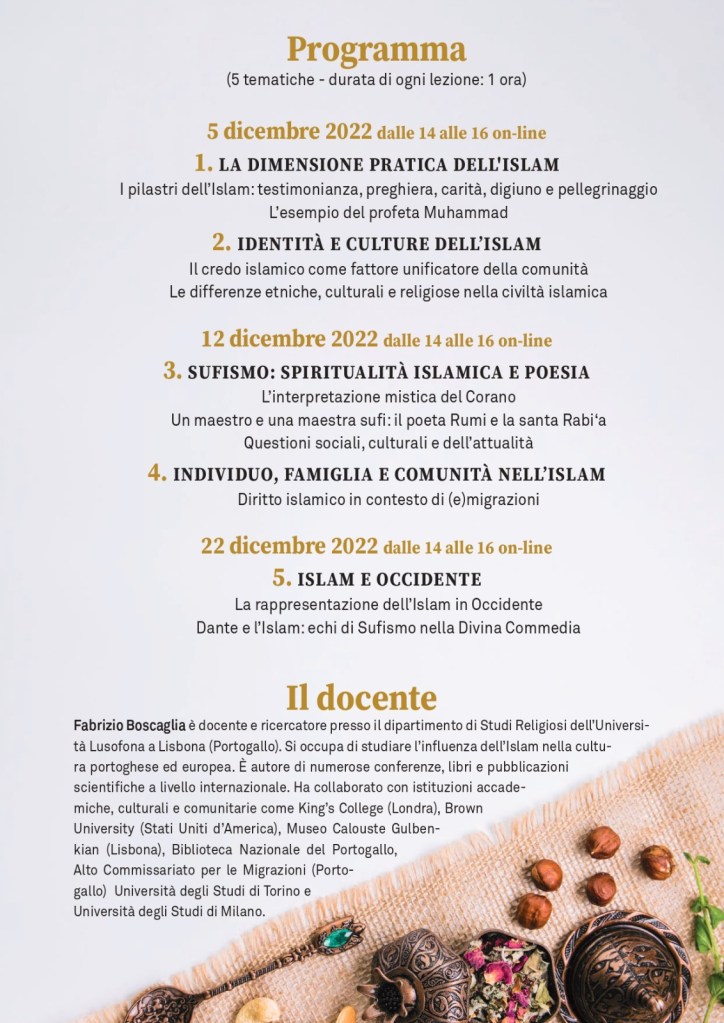 Sou docente do curso online «Cos’è l’Islam» organizado por Eri Educational em língua italiana, agendado para os dias 5, 12 e 22 de novembro de 2022, pela coordenação de Ester Moroni e dirigido a operadores socioculturais ativos principalmente em Itália.