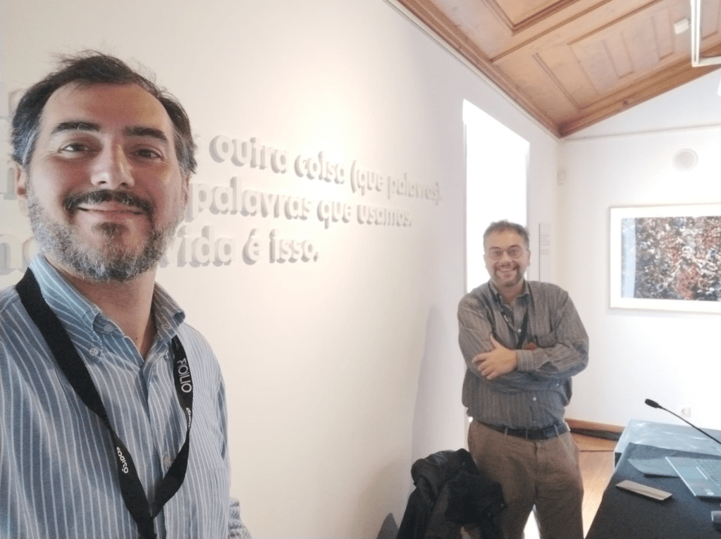 Chegamos a Óbidos ao meio-dia e logo somos acolhidos no ambiente familiar do hotel Josefa d’Óbidos, um sítio de amigos para mim. Aqui tomamos o almoço, na cantina do festival. Logo nos cruzamos com alguns meus colegas e alunos na formação sobre Turismo Literário do Turismo de Portugal, e com outros “cúmplices” em minhas anteriores incursões em Óbidos Vila Literária. O Gianfranco começa a gostar de Óbidos, do clima acolhedor e cordial que aqui se respira. Depois do almoço saímos, a chuva parou, ainda há tempo para um café e um bombom, antes de nos encaminharmos para a Biblioteca Municipal de Óbidos – Casa José Saramago, lugar da nossa sessão.