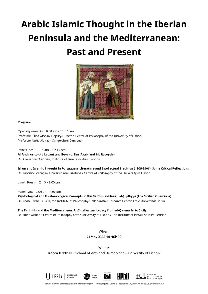 É com muito prazer que aceitei o convite da professora Nuha Alshaar para participar no evento Arabic Islamic Thought in the Iberian Peninsula and the Mediterranean: Past and Present, agendado para 21 de novembro de 2023 na Faculdade de Letras da Universidade de Lisboa. O título da minha comunicação é: «Islam and Islamic Thought in Portuguese Literature and Intellectual Tradition (1906-2006): Some Critical Reflections».