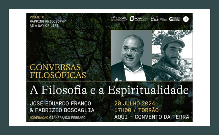 Estou entusiasmado com a oportunidade de conversar sobre «A Filosofia e a Espiritualidade» com um interlocutor de eleição, José Eduardo Franco. Agradeço ao Gianfranco Ferraro pelo convite, no contexto do projeto «Mapping philosophy as a way of life» do Ifilnova, em colaboração com o Centro de Estudos Globais. Em Torrão (Aqui – Convento da Terra), evento agendado para sábado 20 de julho de 2024 às 17h.