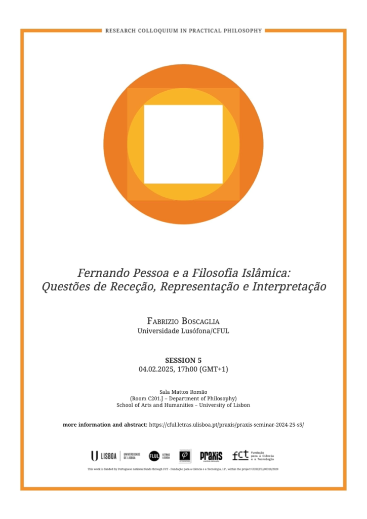Regresso à casa onde realizei o meu doutoramento, nomeadamente ao Centro de Filosofia da Universidade de Lisboa, para participar na qualidade de orador no Seminário do grupo Praxis, com a palestra intitulada «Fernando Pessoa e a Filosofia Islâmica: questões de receção, representação e interpretação», agendada para decorrer na terça-feira dia 4 de fevereiro de 2025 às 17h. Entrada livre.