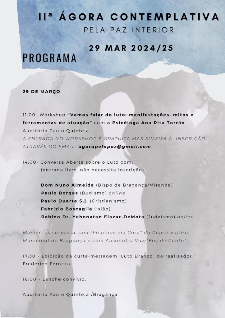 Aceitei com prazer o convite da artista Tânia Oliveira Pires para integrar a mesa de oradores do II Ágora Contemplativa pela Paz Interior, dedicada ao tema do «Luto» nas Tradições Religiosas e Espirituais. No dia 29 de março de 2025 às 14h no Auditório Paulo Quintela em Bragança. Comigo, irão conversar e debater Dom Nuno Almeida, Paulo Borges, Paulo Duarte S. J. e o Rabino Dr. Yehonatan Elazar-DeMota. Entrada livre.