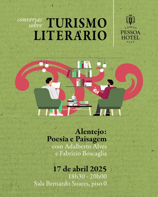 Está agendada para quinta-feira dia 17 de abril de 2025 às 18h30 mais uma das Conversas sobre Turismo Literário, por mim organizadas e dinamizadas no Lisboa Pessoa Hotel. Nesta sessão, o convidado a conversar comigo é o poeta e ensaísta Adalberto Alves. O tema escolhido para esta ocasião é «Alentejo: Poesia e Paisagem». Entrada gratuita mediante inscrição (vagas limitadas).