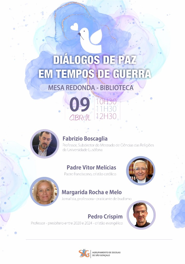 Agradeço à professora Gisela Fialho por me ter convidado a participar enquanto orador na mesa redonda por ela moderada, «Diálogos de Paz em tempo de guerra», na Biblioteca da EB 2,3 do Agrupamento Escolar São Gonçalo, em Torres Vedras. A sessão, destinada aos alunos do 7º ano do Agrupamento, decorre a partir das 10h30. Comigo, conversam Margarida Rocha e Melo, Padre Vitor Melícias e Pedro Crispim.