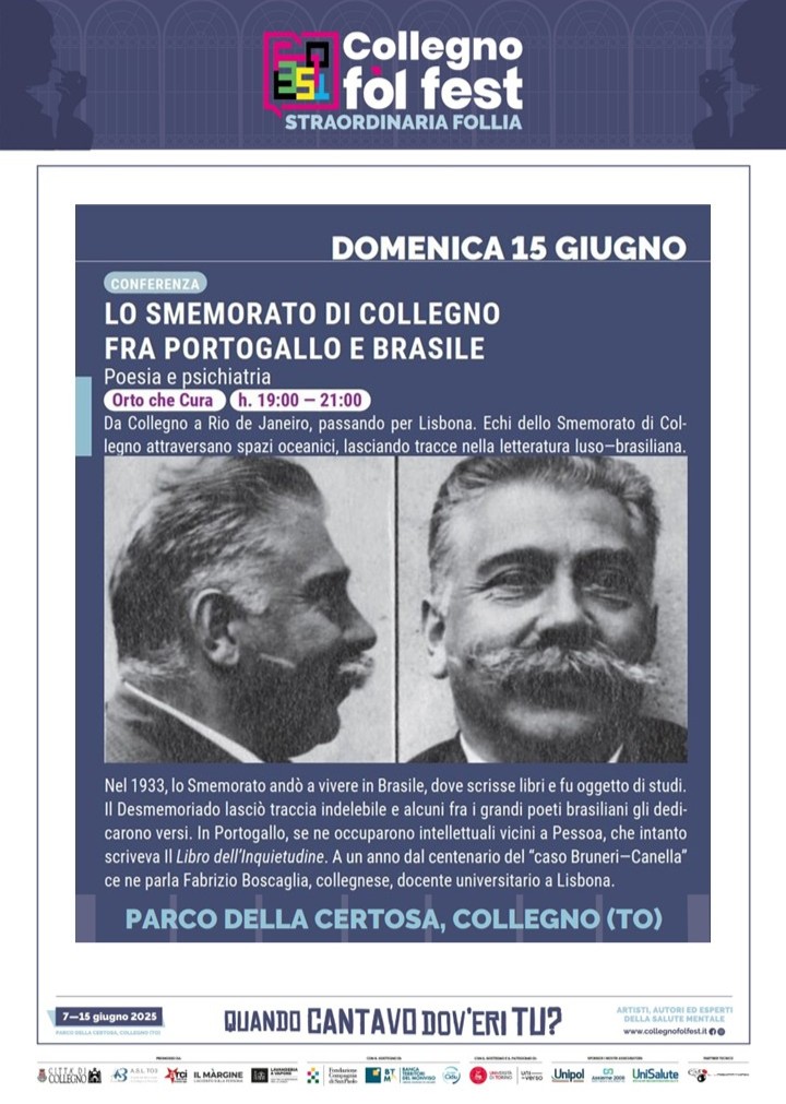 É com grandíssima alegria e entusiasmo que me preparo para participar enquanto orador no Collegno Fòl Fest, festival cultural e científico dedicado à saúde mental, à inclusão e à cidadania, na minha cidade de origem, Collegno, no distrito de Turim (Itália). No dia 15 de junho de 2025 às 19h, se Deus quiser, tenciono proferir a comunicação «Lo Smemorato di Collegno fra Brasile e Portogallo: poesia e psichiatria», nos locais do ex Manicómio de Collegno.