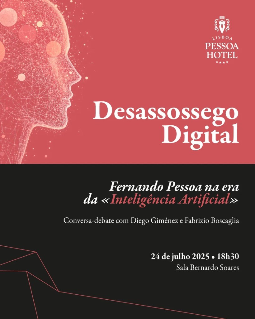 Partilho a mesa com o estimado colega e amigo Diego Giménez da Universidade de Coimbra, no próximo evento do Lisboa Pessoa Hotel, dedicado ao tema «Desassossego Digital: Fernando Pessoa na era da “Inteligência Artificial”». Evento gratuito com inscrição prévia (vagas limitadas). Sejam bem-vindos/as!