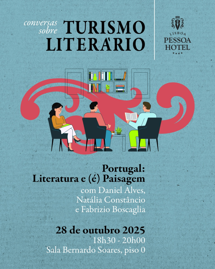 Está agendada para o dia 28 de outubro de 2025 às 18h30, no Lisboa Pessoa Hotel, mais uma sessão das Conversas sobre Turismo Literário, por mim organizadas. Desta vez, o tema é «Portugal: Literatura e (é) Paisagem» e tenho o prazer de conversar sobre ele com Daniel Alves e Natália Constâncio da Universidade Nova de Lisboa. Com entrada livre sujeita à lotação da sala, logo à inscrição prévia.