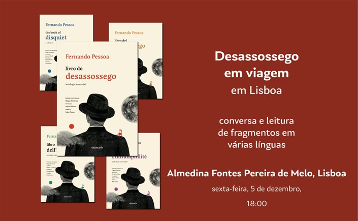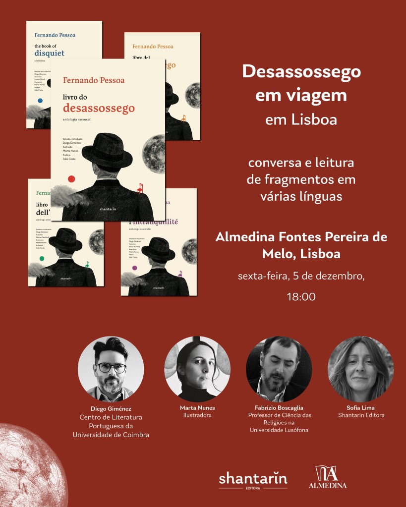 Agendada para sexta-feira dia 5 de dezembro de 2025 às 18h na livraria Almedina Fontes Pereira de Melo, em Lisboa, a conversa Desassossego em viagem conta com a participação de Diego Giménez, Marta Nunes, Sofia Lima e eu. Com base na publicação do livro Livro do Desassossego: antologia essencial, de Fernando Pessoa, organizado por Diego Giménez pela editora Shantarin em 2025.