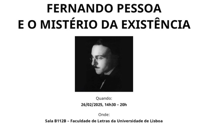 O Colóquio «Fernando Pessoa e o Mistério da Existência», coorganizado por Paulo Borges, Nuno Ribeiro e por mim no âmbito do Centro de Filosofia da Universidade de Lisboa, está agendado para ter lugar na Faculdade de Letras da Universidade de Lisboa, no dia 26 de fevereiro de 2025 a partir das 14h30 e até às 20h, na sala B112B. Entrada gratuita.