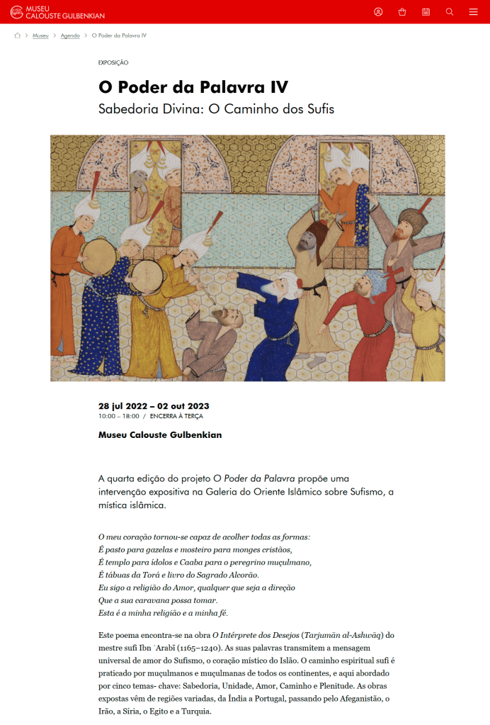 A quarta edição do projeto O Poder da Palavra propõe uma intervenção expositiva na Galeria do Oriente Islâmico sobre Sufismo, a mística islâmica.