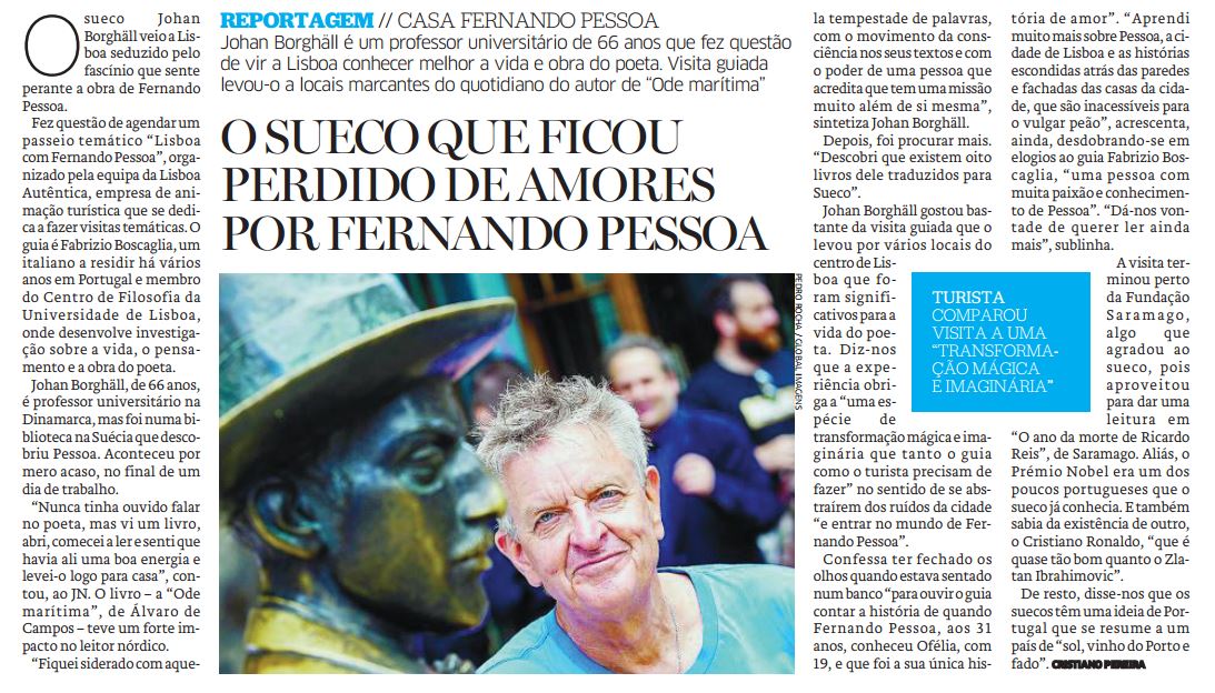 Artigo de Sara Picareta publicado no jornal Time Out Lisboa, sobre os passeios literários “Lisboa com Fernando Pessoa” conduzidos por Fabrizio Boscaglia, organizados pela empresa Lisboa Autêntica, em colaboração com a Casa Fernando Pessoa, em Lisboa.