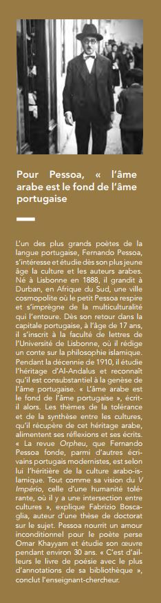 «”La revue Orpheu, que Fernando Pessoa fonde, parmi d’autres écrivains portugais modernistes, est selon lui l’héritière de la culture arabo-islamique. Tout comme sa vision du V Império, celle d’une humanité tolérante, où il y a une intersection entre cultures”, explique Fabrizio Boscaglia, auteur d’une thèse de doctorat sur le sujet.»