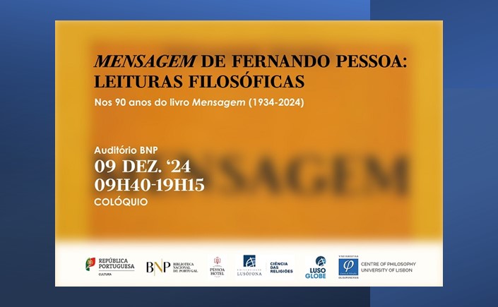 Coorganizo, juntamente com Paulo Borges e Nuno Ribeiro, e participo enquanto orador no colóquio Mensagem de Fernando Pessoa: Leituras FilosóficasNos 90 anos do livro Mensagem (1934-2024), agendado para decorrer a 9 de dezembro na Biblioteca Nacional de Portugal. A minha comunicação intitula-se «Pessoa, o rei-poeta e o rei-filósofo: D. Dinis e D. Duarte em Mensagem». Com parceria do Lisboa Pessoa Hotel, onde organizo e participo em mesa-redonda associada ao evento a 5 de dezembro.