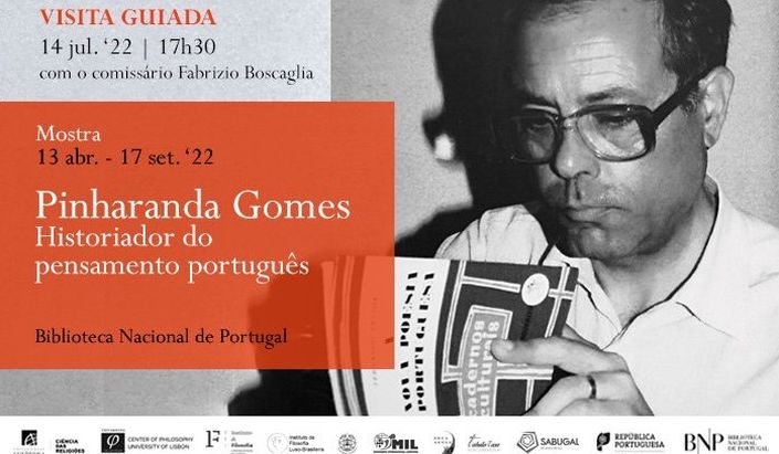 Visita guiada à mostra Pinharanda Gomes: historiador do pensamento português, na Biblioteca Nacional de Portugal a 14 de julho de 2022, com os comissários Renato Epifânio e Fabrizio Boscaglia. Participação gratuita. Inscrição prévia.